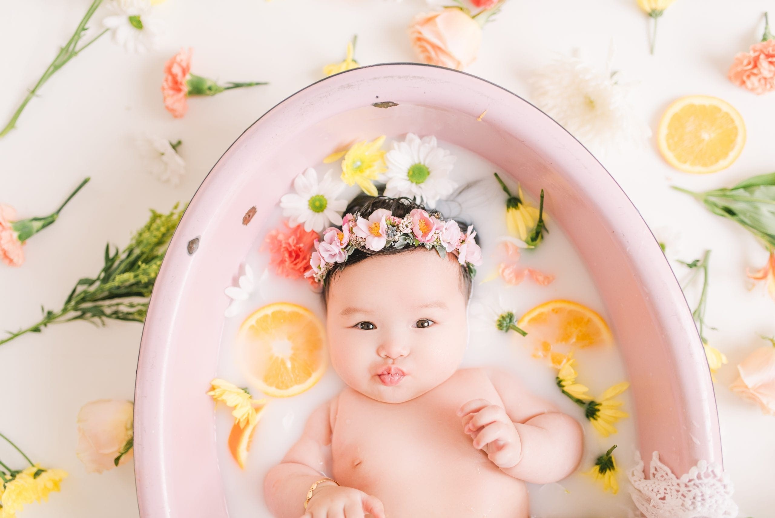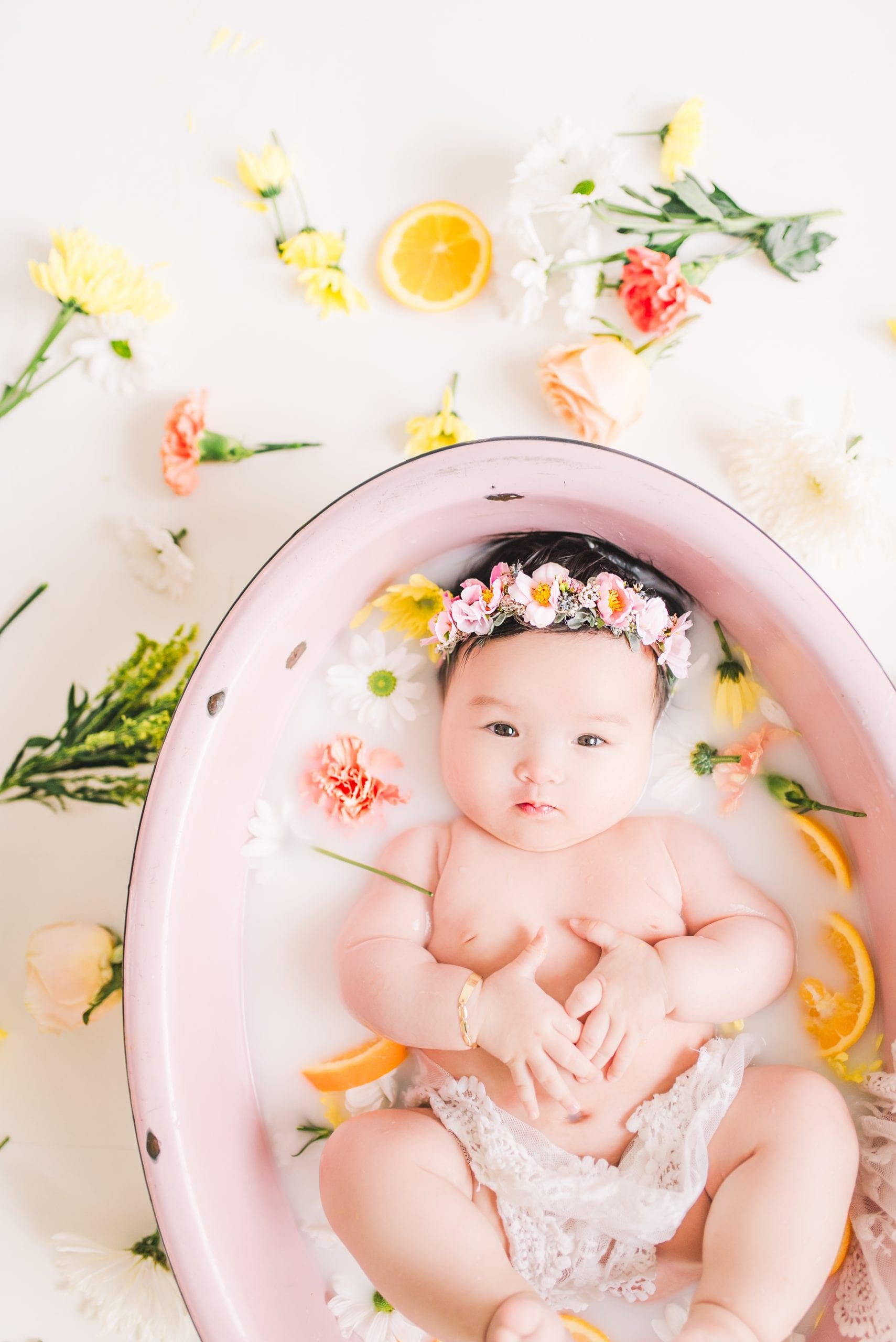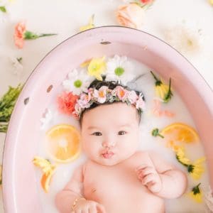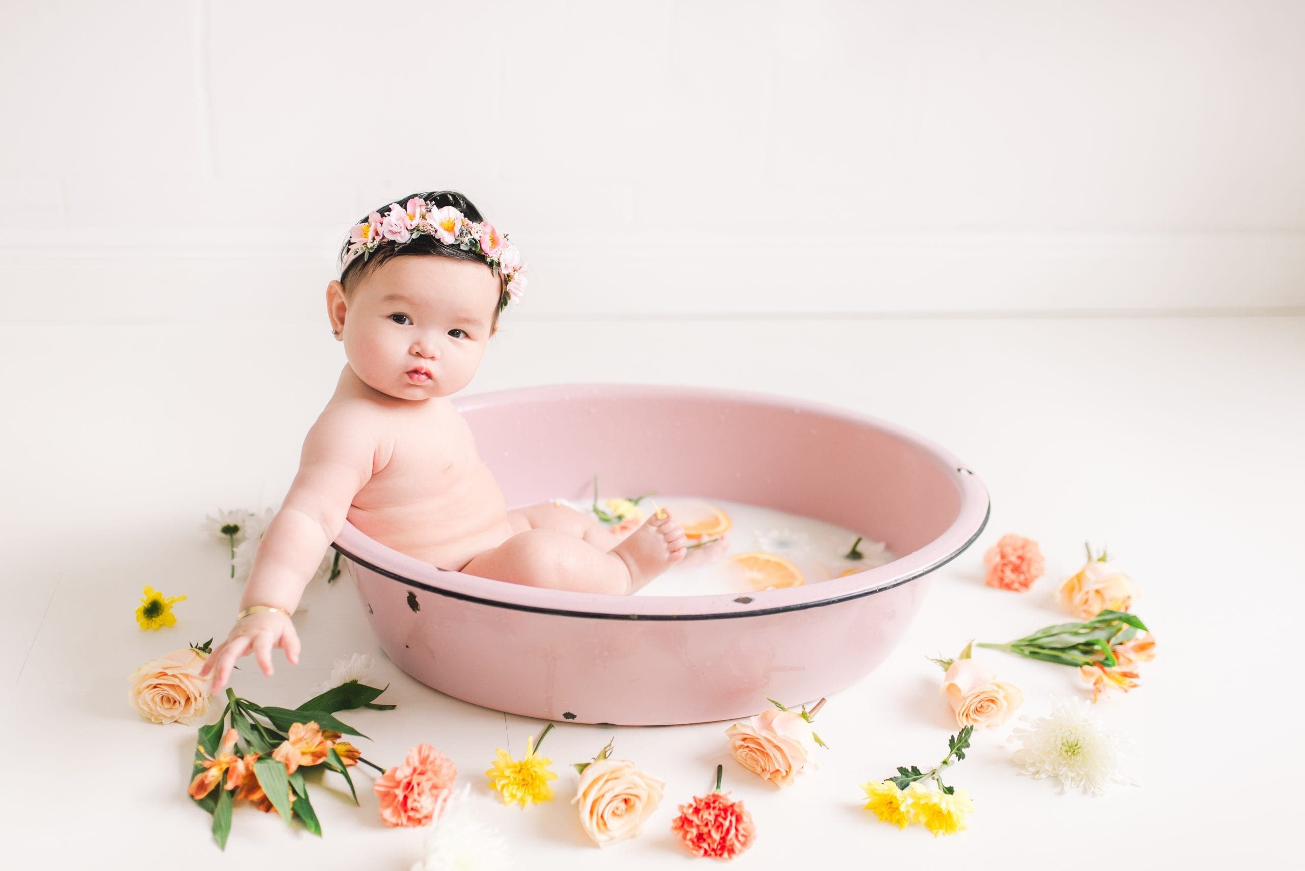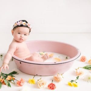 Instead of a controlled backdrop or outdoor location, why not switch it up for a whimsical milk bath session for your baby girl? While no two photos are exactly the same, these dreamy sessions involve filling up a tub with warm water and adding milk to the desired transparency to achieve the most stunning results. Photos can be personalized by choosing different types and colors of flowers that will surround your baby in the beautiful water.